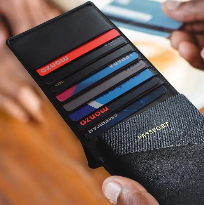 WhimHold Fly Wallet Redefines the Passport Holder. With room for 1 passport, 10 cards, your boarding pass, a mini pen, 3 SIM cards, a SIM ejector, and 2 cash chambers, all in a sleek 0.5 cm profile, who said you can't have it all?